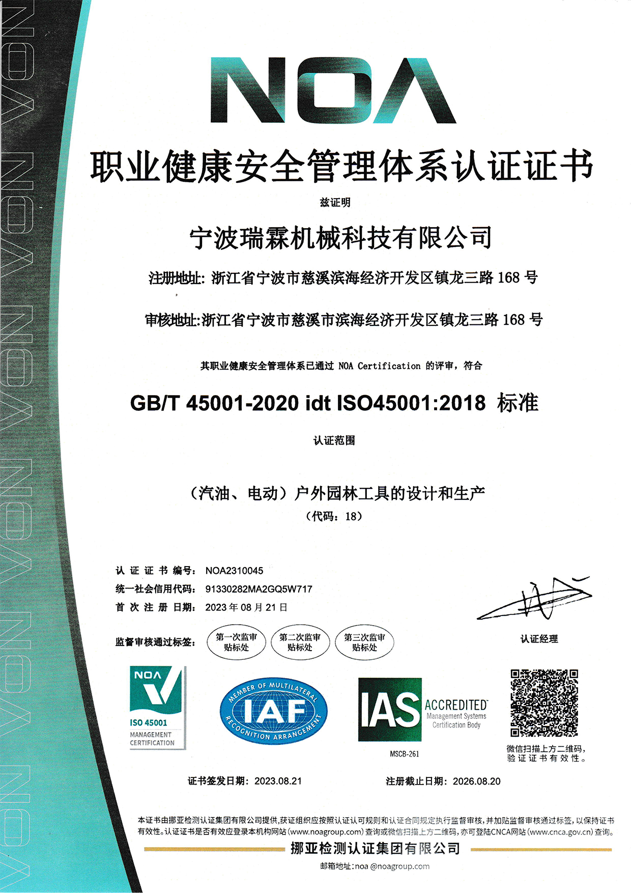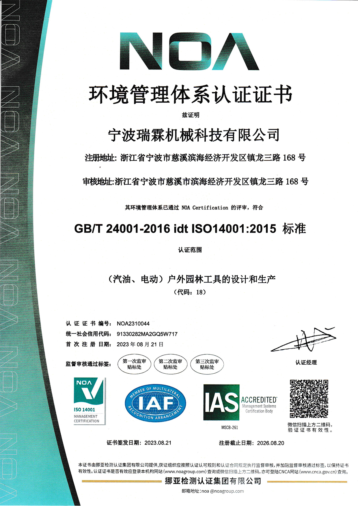 宁波瑞霖机械科技有限公司(简称NGP)是万象城的全资子公司,成立于2019年4月,位于浙江省慈溪滨海经济开发区镇龙三路168号,占地面积约50000平方米。公司拥有雄厚的技术力量和先进的生产设备,是行业内规模最大的企业之一。NGP集产品设计、开发、生产、销售和服务于一体,主要从事各类汽油、割草机、修枝机、打草机、链锯、吹风机等园林工具的设计研发和制造,产品远销欧洲、美洲、大洋洲等多个国家和地区,同时内销全国各地。作为国家知识产权优势企业,公司注重产品设计,并在此基础上采用先进的精益生产方式,以7S活动规范现场管理,以量身打造的ERP系统整合及有效利用企业资源,以ISO 9001:2015等标准来完善公司质量管理体系,并通过“GS”、“EMC”、“CE”、“UL”等认证来确保产品的安全性和可靠性,已取得各地区出口许可证和自营进出口权。
